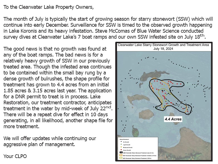 We have continued our program to address the aquatic invasive species, Starry Stonewort, since it was discovered in Clearwater Lake two years ago. On a schedule, divers survey the infested area in addition to the regular survey of the entire lake. On August 19th divers found a new small area of Starry in the back bay 1.27 acres in area, and the divers found a slight expansion of the existing treatment area up to 5.67 acres. In total, we are now treating 6.94 acres. We have discussed treatment plans with our treatment applicator, Lake Restoration, and they have submitted new documentation (shapefiles) to the DNR. Assuming a rapid permit response, their plan is to treat on Monday.